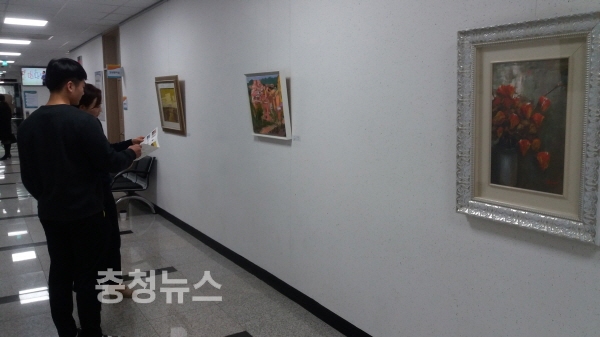 화제의 주인공은 천안시 동남구보건소. 동남구보건소는 지난 15일부터 1, 2층 로비에 ‘찾아가는 한뼘 미술관’을 개관하고 방문민원인들에게 천안지역에서 활동하고 있는 작가들의 작품을 12월 2일까지 전시하고 있다.