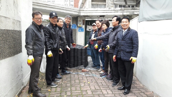 대전 중구의회 이정수 의장이 국제로타리3680지구 대전둔산로타리클럽 이석만 회장 등 회원들과 대전 중구 목동에서 연탄봉사로 구슬땀을 흘렸다.