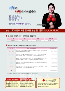 2016년도 논산시 총모금액은 현금 및 물품 등을 포함 9억8백여만원이며 충남사회복지공동모금회를 통해 시에 지원된 예산은 13억으로 지원된 예산은 긴급의료비 및 생계비, 재난재해구호비 등 긴급지원과 저소득학생 돕기, 사회부적응 아동 및 청소년 심리정서지원, 장애인지원, 한부모가정 및 조손가정 지원, 난방비 지원사업 등 생활이 어려운 지역주민과 시설 등에 쓰였다.