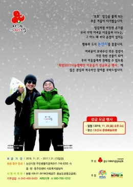 충남 논산시(시장 황명선)는 내년 1월 31일까지 충남사회복지공동모금회의 희망 2017 나눔캠페인 이웃돕기 성금모금행사 지원으로 온정 넘치는 행복한 도시 분위기 조성에 나선다.