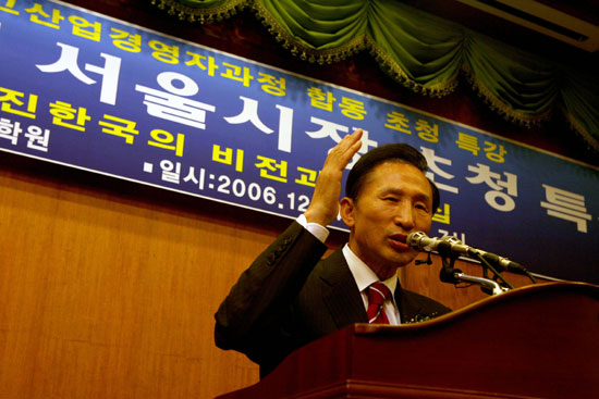 그는 청계천 복원 신화에 이어 대선공약으로"한반도 대운하"라는 한국식 뉴딜정책으로 일자리 창출, 경기부양, 물류혁명, 치수관리(홍수관리, 수자원운용, 수질개선), 내륙개발을 통한 지역균형발전, 관광레저산업 등 다방면에서 국가경제의 부흥과 재도약에 결정적 영향을 미칠 수 있는 공약을 발표하고 있다.