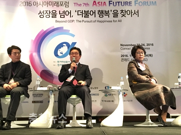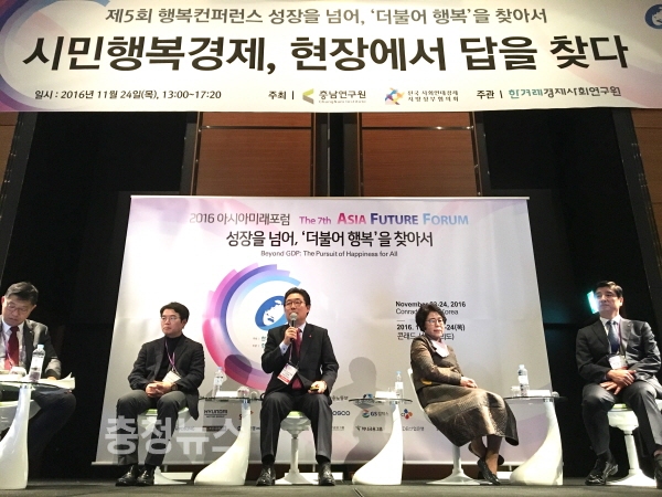 김홍장 당진시장이 24일 서울 콘래드호텔에서 열린 제7회 아시아 미래포럼에 참석해 ‘지역민이 만들어 가는 행복한 삶터’를 주제로 ‘공동체로 하나 되는 당진의 행복한 변화’에 대해 발표했다