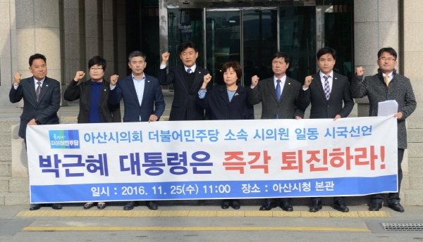 지난 25일 더불어민주당 시의원은 아산시청 현관에서 시국선언을 발표하고 “박근혜 대통령은 국민을 배신하고 국정을 우롱한 책임을 지고 즉각 퇴진하라”고 강력하게 외쳤다.