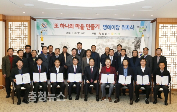 한편 당진시는 이번 위촉식에 앞서 지난 8월 17일 김홍장 시장과 농협당진시지부 최석동 지부장이 ‘당진시장 명예이장 위촉 및 업무협약’을 체결하고 또 하나의 마을 만들기 운동을 통해 농업‧농촌에 활력을 불어 넣는 도농혁신운동을 전개해 나가기로 합의한 바 있다.