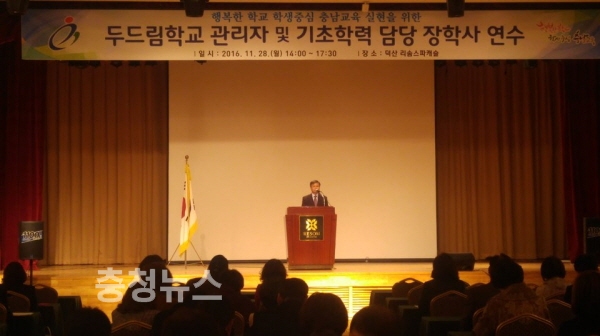 충남도교육청(교육감 김지철)은 28일 두드림학교 관리자 및 기초학력 담당 장학사, 두드림학교 컨설턴트 108명이 참석한 가운데 예산 리솜스파캐슬에서 기초학력향상을 위한 교원 역량강화 연수를 실시했다.