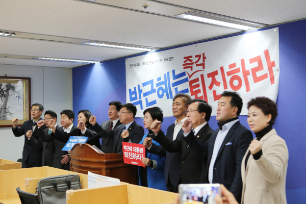 더불어민주당 의원들은 “1987년 6월 온 국민의 숭고한 투쟁으로 이룬 이 땅의 민주주의와 국민신뢰가 처참하게 무너졌다”며 “박근혜 대통령과 최순실 등 비선실세들에 의해 이 땅의 대의민주주의도 송두리째 무너졌다”고 분노했다.