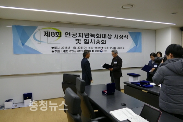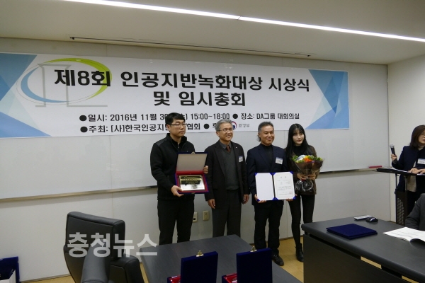 충남 아산시(시장 복기왕)가 지난 2015년 8월에 준공된 그린빗물인프라 조성사업과 관련해 11월 30일 서울시 강남구 DA그룹 지하 대회의실에서 열린 제8회 인공지반녹화대상(환경부 후원, 한국인공지반협회 주최)에서 ‘최우수상’을 수상했다.