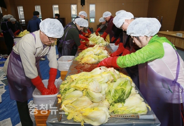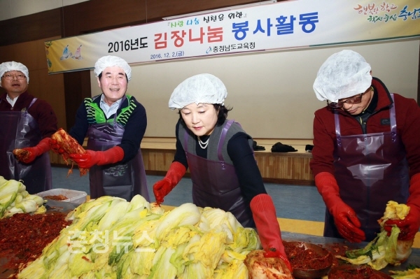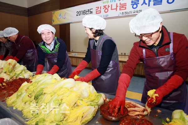 충남도교육청(교육감 김지철)은 2일 도교육청 다목적실에서 연말 사랑나눔 실천으로 지역사회와 함께하는 공직문화를 조성하고 우리사회 소외된 이웃이 따뜻한 겨울을 보낼 수 있도록 김장나눔 봉사활동을 실시했다.