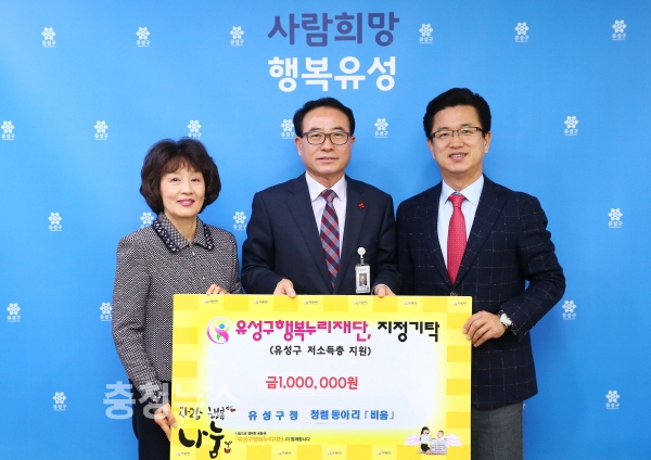 <사진자료 1> 대전 유성구 청렴동아리 ‘비움’(회장 김신환, 유성구 감사실장)이 5일 구청 행복사랑방에서 저소득계층 지원을 위해 써달라며 100만원의 후원금을 유성구행복누리재단에 지정 기탁한 가운데, 허태정 유성구청장(오른쪽 1번째), 김신환 청렴동아리 회장(오른쪽 2번째), 김홍혜 유성구행복누리재단 이사장(오른쪽 3번째)이 기념사진을 찍고 있다.