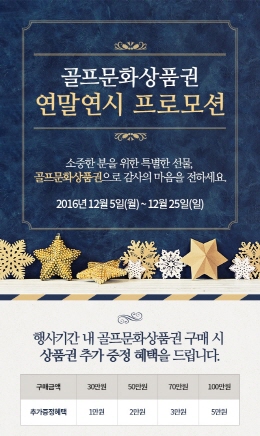 행사기간 동안 골프문화상품권 30만원 이상 구매 시 상품권 1만원권을 추가 증정하고, 50만원 이상 구매 시 2만원권, 70만원 이상 구매 시 3만원권, 100만원 이상 구매하는 고객에게는 5만원권을 각각 추가 제공한다.