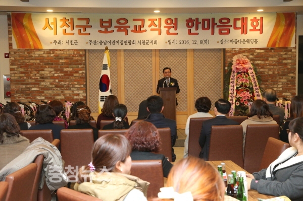 충남어린이집연합회 서천군지회(회장 이경희)는 6일 아름다운웨딩홀에서 어린이집 원장과 보육교사 등 300여 명이 참석한 가운데 ‘2016년 서천군 보육교직원 한마음대회‘를 개최했다.