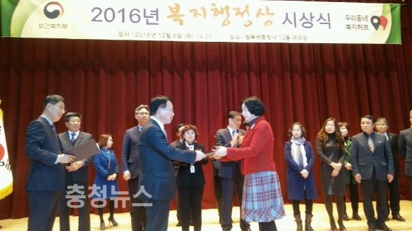 대전 중구(구청장 박용갑)는 2016년 지역복지사업 평가에서 ‘희망복지지원단 운영부분’ 우수지자체로 선정됨에 따라 지난 6일 정부세종청사에서 개최된 ‘2016년 복지행정상 시상식’에서 보건복지부장관 표창과 상금 1천만원을 받았다고 밝혔다.
