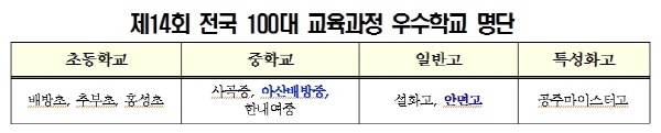 교육과정 우수학교는 ‘교실수업개선을 통한 행복한 학교교육 실현’을 위해 학생중심 교육과정을 운영한 학교를 교육부가 선정한 것이다. 특히 우수학교로 선정된 9개교 중 아산배방중(교장 최지석), 안면고(교장 김형근)가 전국 최우수교로 선정됨으로써 도교육청이 추구해온 학생이 행복한 학교 교육과정 운영이 그 결실을 맺게 됐다. 충남도교육청은 2014년에 초 4곳, 중 3곳, 고 2곳, 지난해에는 초 4곳, 중 4곳, 고 3곳이 선정되는 등 해마다 전국 최고의 성과를 거두고 있다.