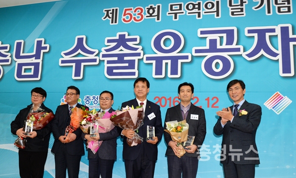 수출 유공 도지사 표창은 김상도 지니스 대표와 허상희 ㈜유진 대표, ㈜에프엠 손호식 부장, ㈜이-글벳 정연근 공장장, 수출유관기관 종사자인 충남경제진흥원 조광옥 과장 등 5명이 받았다.