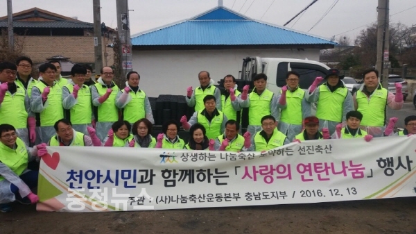 농협중앙회 충남지역본부(본부장 유찬형)는 나눔축산운동 충남도지부(지부장 천안축협 조합장 정문영), 성환농협(조합장차상락)임직원들과 함께 12.13(화) 아웃과 함께 따뜻한 겨울나기 「사랑의 연탄나눔」행사를 가졌다.