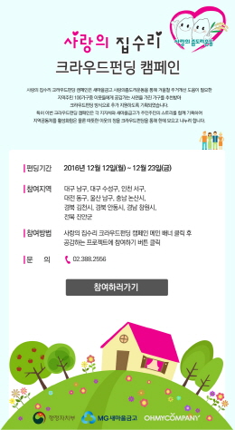 수리 모금액 크라우드펀딩은 12.12(월)부터 12.23(금)까지 12일간 이뤄지며, 온라인 플랫폼인 오마이컴퍼니 사랑의 집수리 페이지(www.ohmycimpany.com)를 통해 누구나 참여할 수 있다.
