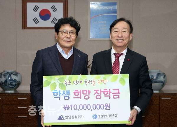 대전광역시교육청(교육감 설동호)은 14일 교육청 접견실에서 ㈜영남강철(대표 최성대)로부터 장학금 1천만 원을 기탁 받았다.