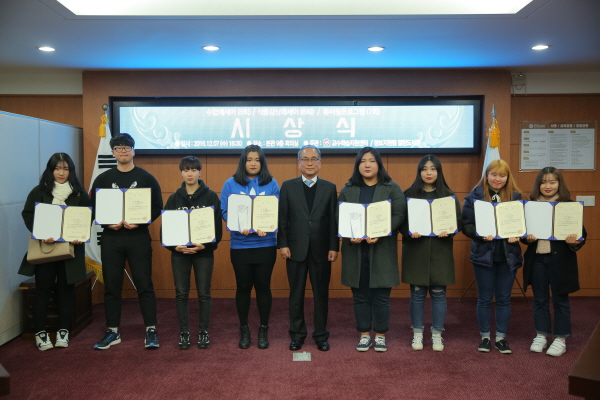 한국영상대 유재원 총장과 튜터링 수상자들이 시상식 후 기념사진을 찍고 있다.