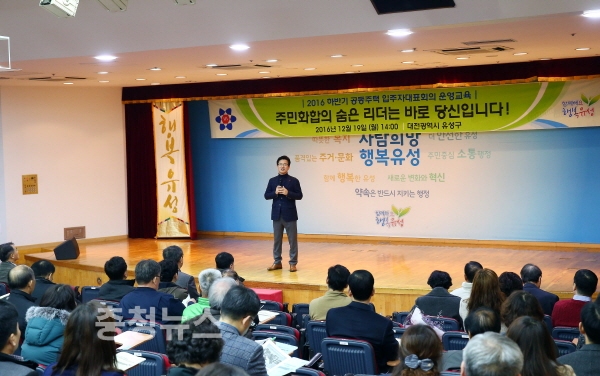 대전 유성구(구청장 허태정)는 19일 구청 대강당에서 관내 202개 공동주택 입주자대표회의 구성원과 관리사무소장 등 250여 명이 참석한 가운데 공동주택 입주자대표회의 운영교육을 실시했다고 밝혔다.