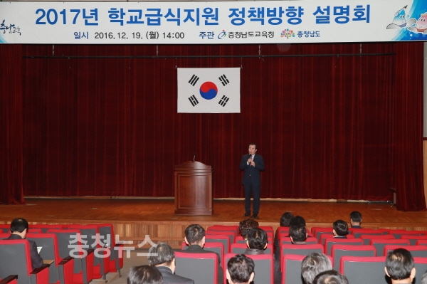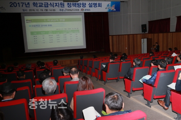 충남도교육청(교육감 김지철)은 고등학교 학교장과 운영위원장 234명을 대상으로 내년도 학교급식지원의 정책방향에 대한 설명회를 19일 충남농업기술원에서 가졌다.