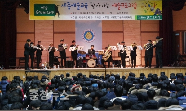 세종 두루중학교(교장 윤재국)가 지난 19일 두루중 다목적강당에서 1~3학년 학생을 대상으로 세종시교육청이 주관하고 (재)한국문화복지재단이 후원하는 찾아가는 예술프로그램인 ‘세종음악비타민’을 개최했다.