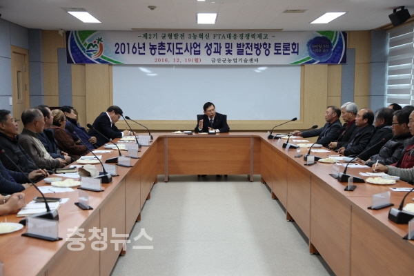 금산군농업기술센터(소장 이갑수)는 19일 오후 2시 금산군농업기술센터 1층 다목적회의실에서 박동철 군수를 비롯한 금산군품목농업인연구협의회 임원진과 품목연구회 회장단 등 50여명이 참석한 가운데 2016년 농촌지도사업 성과보고 및 발전방안 토론회를 가졌다.