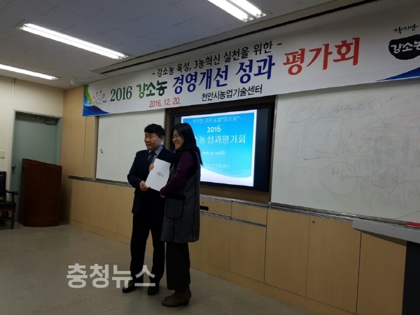 충남 천안시농업기술센터(소장 강성수)는 20일 농업기술센터 교육장에서 강소농 교육에 참여한 농업경영체 60여명을 대상으로 2016강소농 농업경영체 성과평가 및 수료식을 개최했다.