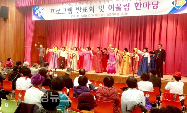 대전 중구(구청장 박용갑)는 22일 효문화마을 대강당에서 프로그램 참여자 및 관람객 300여 명이 참석한 가운데 ‘프로그램 발표회 및 어울림 한마당’을 개최했다.