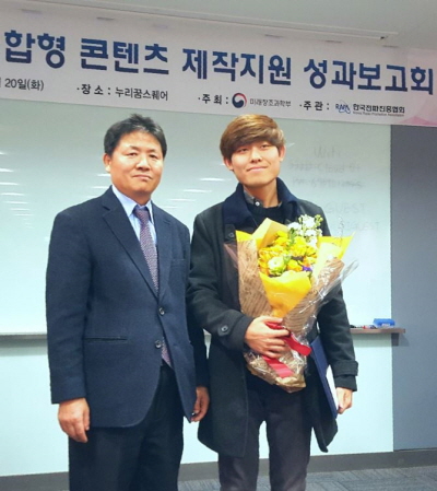 한국영상대 유승엽 학생(오른쪽)이 글로벌 창의콘텐츠 크리에이터 공모전에서 최우수상 수상 후 기념 사진을 찍고 있다.