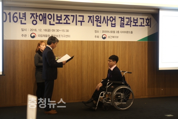 지난 16일(금) 충남대학교병원 內 대전광역시보조기구센터(센터장 복수경)를 이용하는 김재원(남, 21) 학생이 국립재활원 중앙보조기구센터에서 주최하는 [2016 전국민 보조기구 사진 공모전]에서 “꼭 걷고 싶던 길 위에서”라는 작품으로 대상인 보건복지부장관상을 수상하였다.