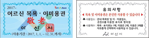 아산시(시장 복기왕)는 65세 이상 어르신에게 2017년 상반기분 노인 목욕 및 이·미용권을 1월 2일부터 지급한다고 밝혔다.