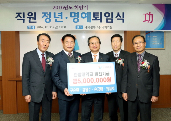 특히, 이날 퇴임식에는 평생 몸 담고 일해 온 직장에 대한 고마운 마음을 모아 대학의 무한한 발전을 기원하며 발전기금 500만을 전달해 주위에 훈훈함을 안겨주었다.