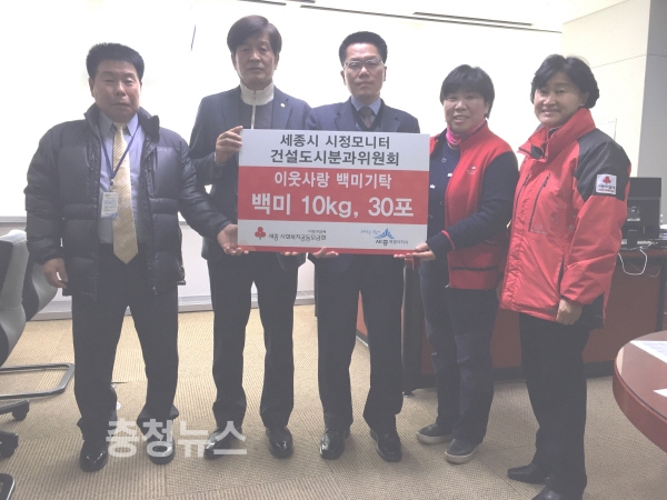 세종특별자치시(시장 이춘희) 시정모니터 건설도시분과 위원(위원장 김대희)들이 백미 10Kg 30포를 사회복지공동모금회에 기탁했다.