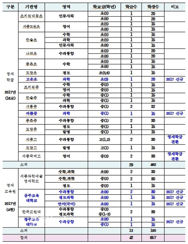 2017년 세종시 영재교육기관 현황 / 충청뉴스 최형순 기자