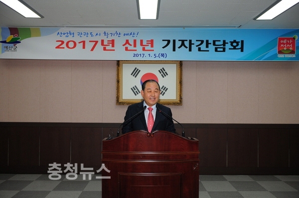 예산군이 5일 군청 제1회의실에서 2017년도 새해를 맞아 신년 기자 간담회를 개최해 올해 군정 운영 방향을 제시했다.
