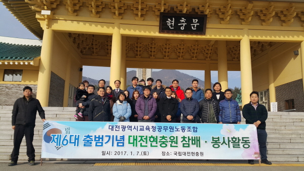 대전광역시교육청공무원노동조합(위원장 한상호)은 7일 오전, 임원 및 조합원이 참석한 가운데 국립대전현충원에서 참배․봉사활동을 시작으로 정유년 제6대 대전교육노조 출범을 힘차게 알렸다.