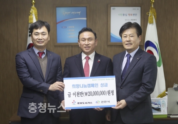 천안시 일원에 도시가스를 공급하고 있는 중부도시가스(주)(대표이사 김병표)는 지난 5일 사랑의 이웃돕기 성금으로 2,000만원을 기부하며 천안시복지재단과 사회복지공동모금회에 각 1,000만원씩 기탁했다. 기부금은 천안시내 어려운 이웃을 위해 쓰일 예정이다.