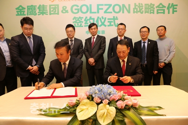 앞줄 왼쪽부터 골프존유원그룹 김영찬 회장과 진잉그룹 왕헝 회장이 지난 10일 중국 남경 진잉그룹 본사에서 열린 ‘골프존유원그룹-중국 진잉그룹 중국 골프 시장 활성화 및 합자법인 설립 위한 MOU’ 체결식에서 업무제휴 협약서에 서명을 하고 있다.