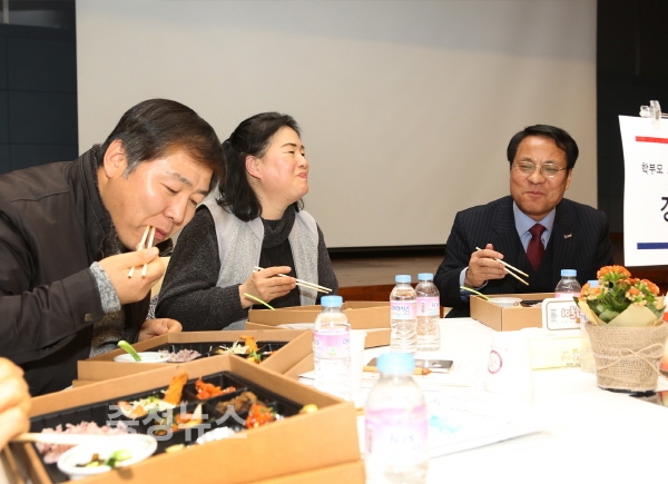한남대 이덕훈 총장(사진 맨 오른쪽)이 12일 학부모초청 진로&취업 간담회에서 학부모들과 도시락 식사를 하며 대화하고 있다.