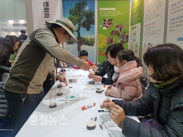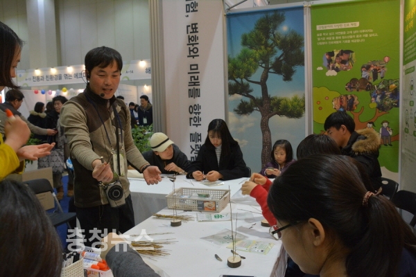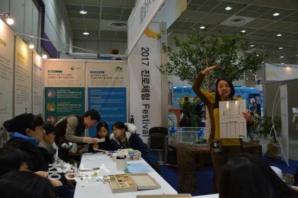 '2017 진로체험페스티벌'이 열린 서울 코엑스 A1,2 전시장에서 한국산림복지진흥원 직원이산림청 부스를 방문한 학생들을 대상으로 솟대 만들기 체험을 설명하고 있다