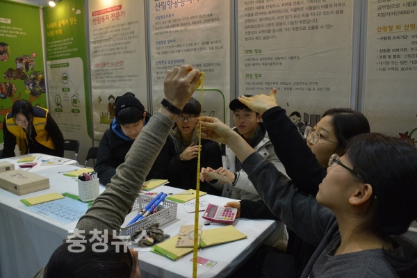 11일 '2017 진로체험페스티벌'이 열린 서울 코엑스 A1,2 전시장에서 한국산림복지진흥원 직원이 산림청 부스를 방문한 학생들을 대상으로 수고(나무의 높이) 측정방법에 대해 설명하고 있다..