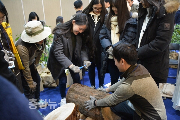 '2017 진로체험페스티벌'이 열린 서울 코엑스 A1,2 전시장에서 산림청 부스를 방문한 학생들이 나무의 나이를 알아보기 위한 체험을 하고 있다