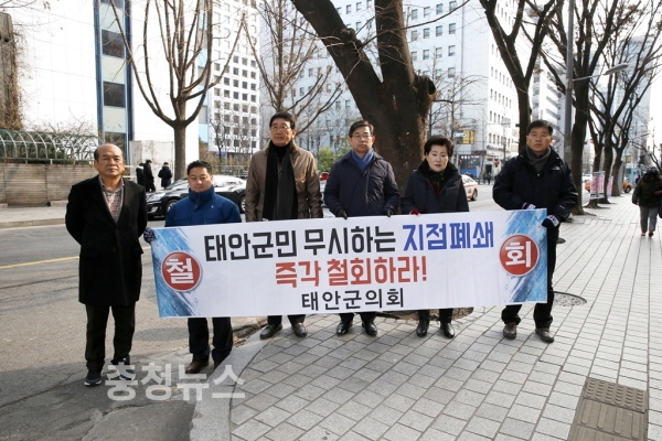 충남 태안군의회 이용희 의장을 비롯한 6명의 의원들은 지난 12일 서울 여의도에 있는 kb국민은행 본점을 찾아가 kb국민은행 태안지점의 폐점에 반대하는 항의 시위에 나섰다.