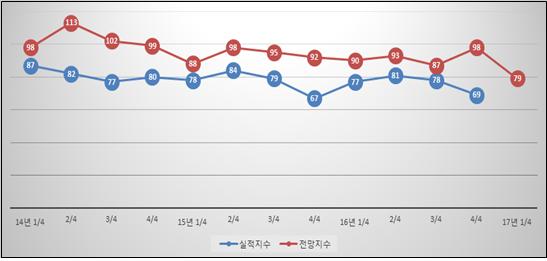한편, 기업경기실사지수(BSI)는 기업들의 현장체감경기를 수치화한 것으로 100 이상일 때는 경기가 전분기에 비해 호전될 것으로 예상하는 기업이 더 많다는 것을 의미하고, 100 미만이면 그 반대를 의미한다