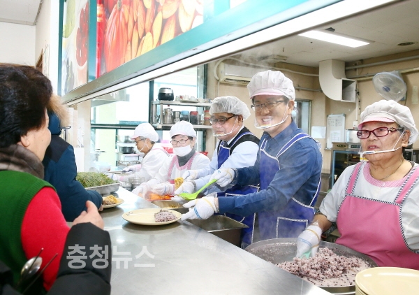 대전 유성구 허태정 유성구청장(오른쪽 두 번째)은 16일 정유년 새해를 맞아 신성동 소재 유성구노인복지관에서 배식봉사를 했다.