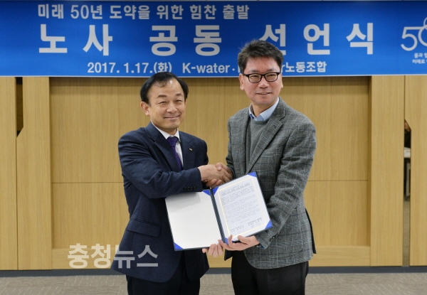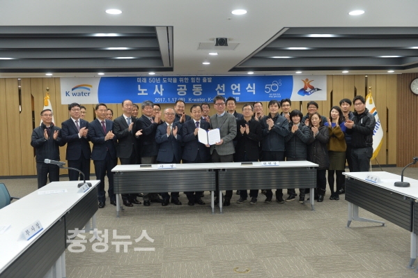 K-water 이학수사장과 노사는 2017. 1. 17 본사(대전시 대덕구)에서 공사창립 50주년, 노조창립 30주년을 맞아 ‘미래도약을 위한 노사 공동선언’을 했다.