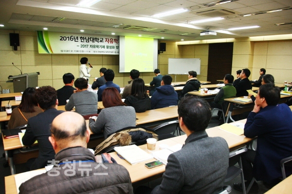 한남대는 17일 오후 2시 교내 56주년기념관에서 대전지역 최초로 ‘자유학기제 컨퍼런스’를 개최하고 지난해 1년 동안 운영한 자유학기제 프로그램들에 대해 사례발표와 자유학기제 활성화 방안 모색의 시간을 가졌다. 이날 컨퍼런스에는 중학교 교사들과 교육청 관계자, 각 대학 관련학과 교수 등 70여 명이 참석했다.