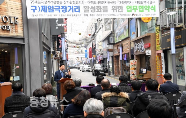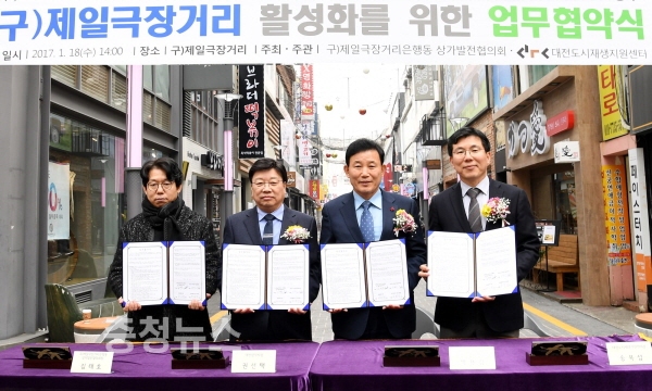 대전 중구 박용갑구청장은 18일 옛 제일극장거리에서 대전시와 도시재생지원센터 및 제일극장거리 상가발전협의회와 상권활성화를 위한 상호협력 및 지원 업무협약을 체결했다.