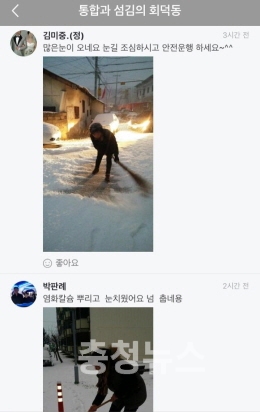 새벽부터 내린 강설로 아침 출근길의 혼잡이 예상되던 20일 새벽. 대덕구 각 동의 SNS(밴드)에는 때 아닌‘내 집(점포, 회사) 앞 눈치우기’인증 릴레이가 펼쳐졌다.