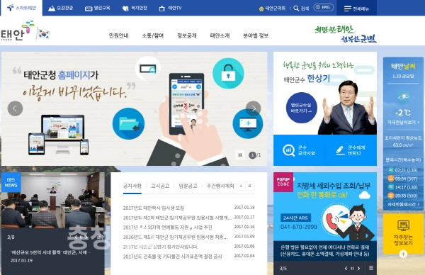군은 정부 3.0 구현에 부합하고 IT 환경 변화에 대응하기 위해 지난해 8월부터 군 공식 홈페이지 개편에 돌입, 4개월만인 지난해 12월 개편을 마무리하고 올해부터 새로운 모습의 홈페이지(http://www.taean.go.kr)를 선보인다고 00일 밝혔다.